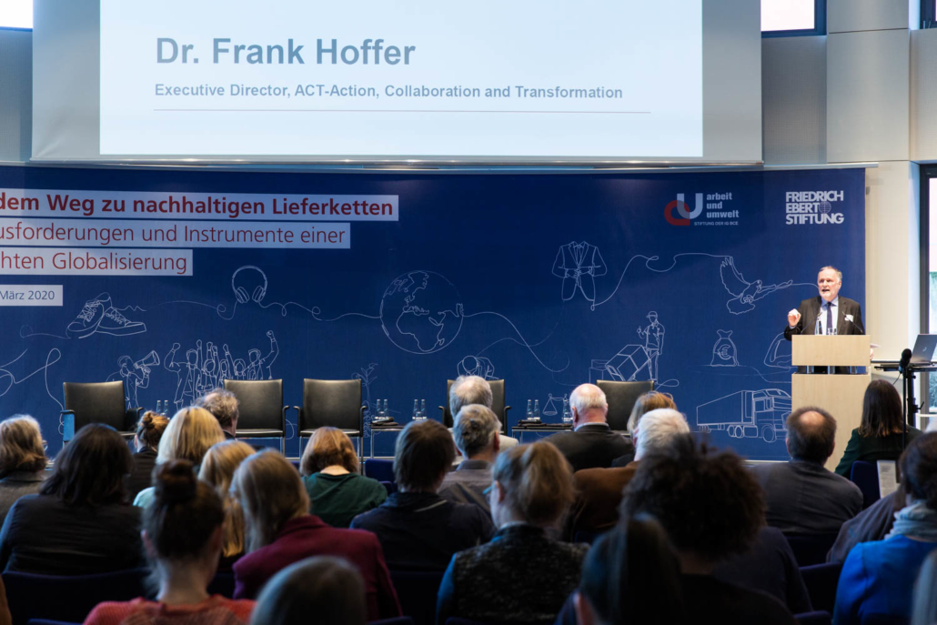 Dr. Frank Hoffer stellte einen Zusammenschluss von 21 Textilunternehmen mit dem internationalen Gewerkschaftsverband IndustriALL vor, deren Geschäftsführer er ist: „Action, Collaboration, Transformation“ setze sich in einer von Niedriglohn und schlechten Arbeitsbedingungen geprägten Industrie für existenzsichernde Löhne ein. Die Konkurrenz zwischen Niedriglohnländern sei in der stark globalisierten Bekleidungsindustrie hoch, sagte Hoffer; durch den Markt allein werde sich das nicht ändern. Es brauche einen internationalen Mindestlohn und eine Handelspolitik der Europäischen Union, die die zollfreie Einfuhr von Textilien mit der Einhaltung von Menschenrechten verknüpft.