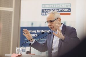 Nach einem Grußwort von Andrea Arcais lobte Michael Vassiliadis in seiner Rede den schnellen Aufbau einer professionellen Struktur, die angesichts der aktuellen wirtschaftlichen Situation wichtiger denn je sei. Besonders betonte er die Bedeutung der Vertrauensbildung bei den Betriebsräten, für die das Kompetenznetz Expert:innen vermittelt. Vertrauen sei ein entscheidender Faktor für eine erfolgreiche Zusammenarbeit und die zukünftige Arbeit in der Transformationsberatung.