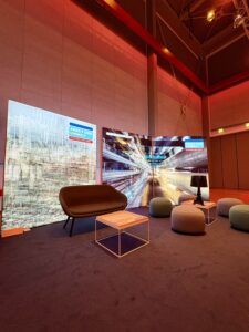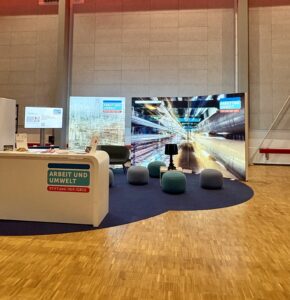Eingerahmt wurde unser Stand von künstlerischen Fotografien des Fotografen Veit Mette. Die auf großen, beleuchteten Wänden präsentierten Ansichten zeigten zum einen das Innenleben des Papierproduzenten LEIPA in Schwedt/Oder (Brandenburg), zum anderen die Außenansicht des Chemparks Marl (Nordrhein-Westfalen).